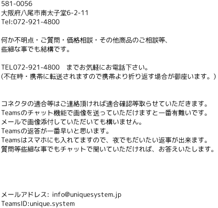 ■送料について [全国一律280円便(税込)] 定形郵便・定形外郵便 重量・サイズにより送料に変動がありますが、一律と致します。 スプール巻電線等一部大型商品は不可です。 重量によって、クロネコヤマトネコポス、レターパックへ変更の場合がありますが送料は280円のままです。 ※定形郵便・定形外郵便は追跡無し、到着まで3-6日程度かかります。 2021年10月以降より土曜日の配達が廃止となりました。 土日を挟む場合はかなりの日数がかかります。 お急ぎの方には向きません。 お急ぎの場合は360円便などを選択下さい。 [全国一律360円便(税込)] クロネコヤマトネコポス・レターパックライト・レターパックプラス・佐川急便 上記3種の発送方法の中から、商品の梱包状況により選択し、発送します。 速達扱い・追跡ありです。 [全国一律600円便(税込)] レターパックプラス・佐川急便(離島などの場合はゆうパック・クロネコ宅急便の場合があります。) 上記の発送方法の中から、商品の梱包状況により選択し、発送します。 速達扱い・追跡ありです。 [佐川急便 飛脚宅配便(税込)] 北海道 759円 北東北 726円 南東北 704円 関東・信越 682円 東海・北陸・関西・中国 649円 四国・九州 682円 沖縄県 飛脚宅配便での発送不可/クロネコヤマト宅急便2,068円での発送となります。 速達扱い・追跡あり・補償付きです。 [クロネコヤマト宅急便(税込)] 北海道 2,200円 北東北 1,606円 南東北 1,474円 関東・信越 1,122円 中部・北陸・関西・中国 1,001円 四国・九州 1,020円 沖縄 2,068円 速達扱い・追跡あり・補償付きです。 一部大型商品は、[全国一律280円]と、[全国一律360円]を選択できません。 ※20,000円以上お買い上げのお客様は、送料無料となります。(※クロネコヤマト宅急便は送料無料対象外です。) お振込み先銀行【先払いとなります】 三菱UFJ銀行/三井住友銀行/ゆうちょ銀行/ペイペイ銀行/楽天銀行/住信SBIネット銀行 振り込みに係る手数料はお客様負担となります。 ※日本国内のみの発送となります。 海外への発送は事前にお問い合わせ下さい。 |