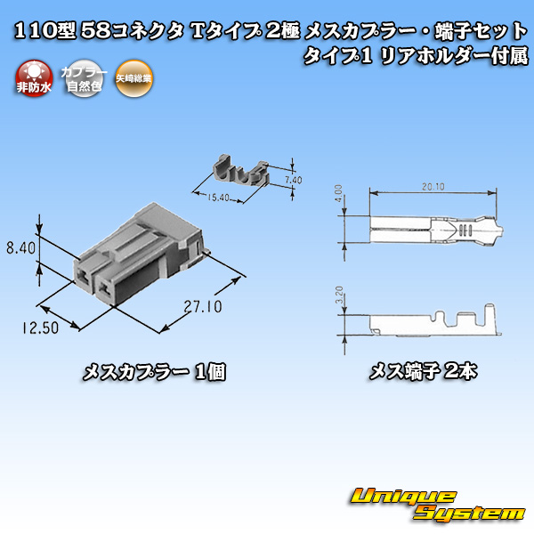 矢崎総業 110型 58コネクタ Tタイプ 非防水 2極 メスカプラー・端子セット タイプ1 リアホルダー付属