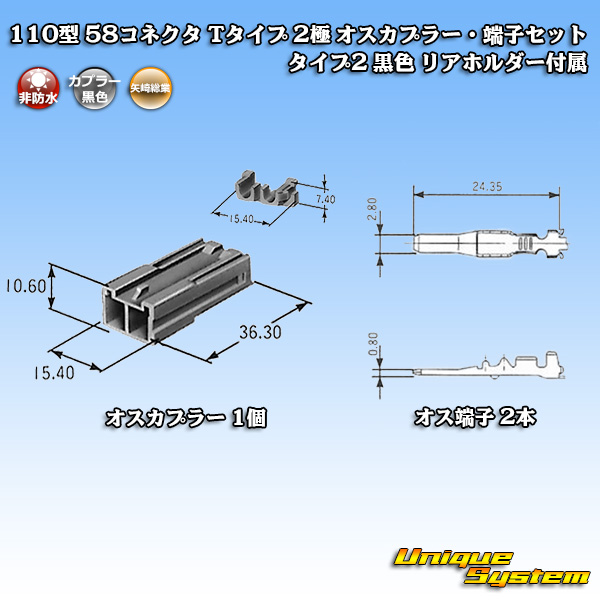 矢崎総業 110型 58コネクタ Tタイプ 非防水 2極 オスカプラー・端子セット タイプ2 黒色 リアホルダー付属
