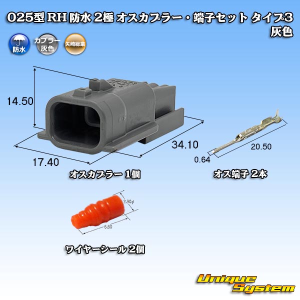 矢崎総業 025型 RH 防水 2極 オスカプラー・端子セット タイプ3 灰色 [戻る]