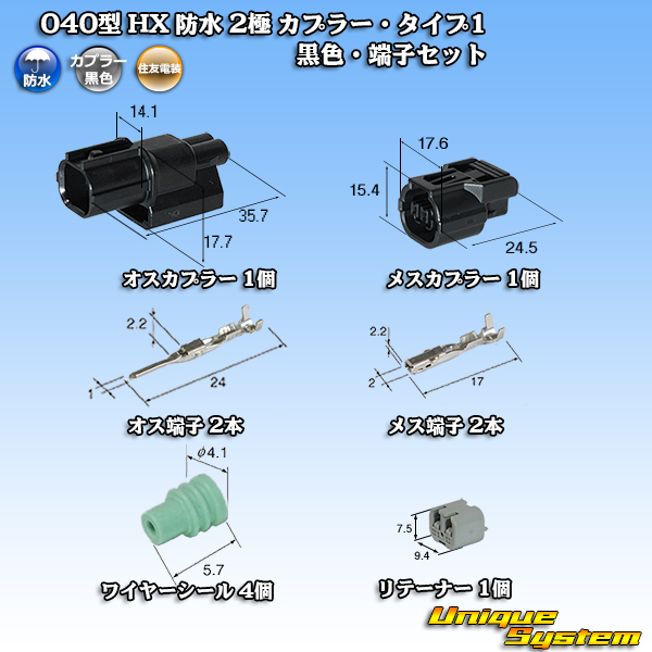 住友電装 040型 HX 防水 2極 カプラー・端子セット リテーナー付属 タイプ1 黒色